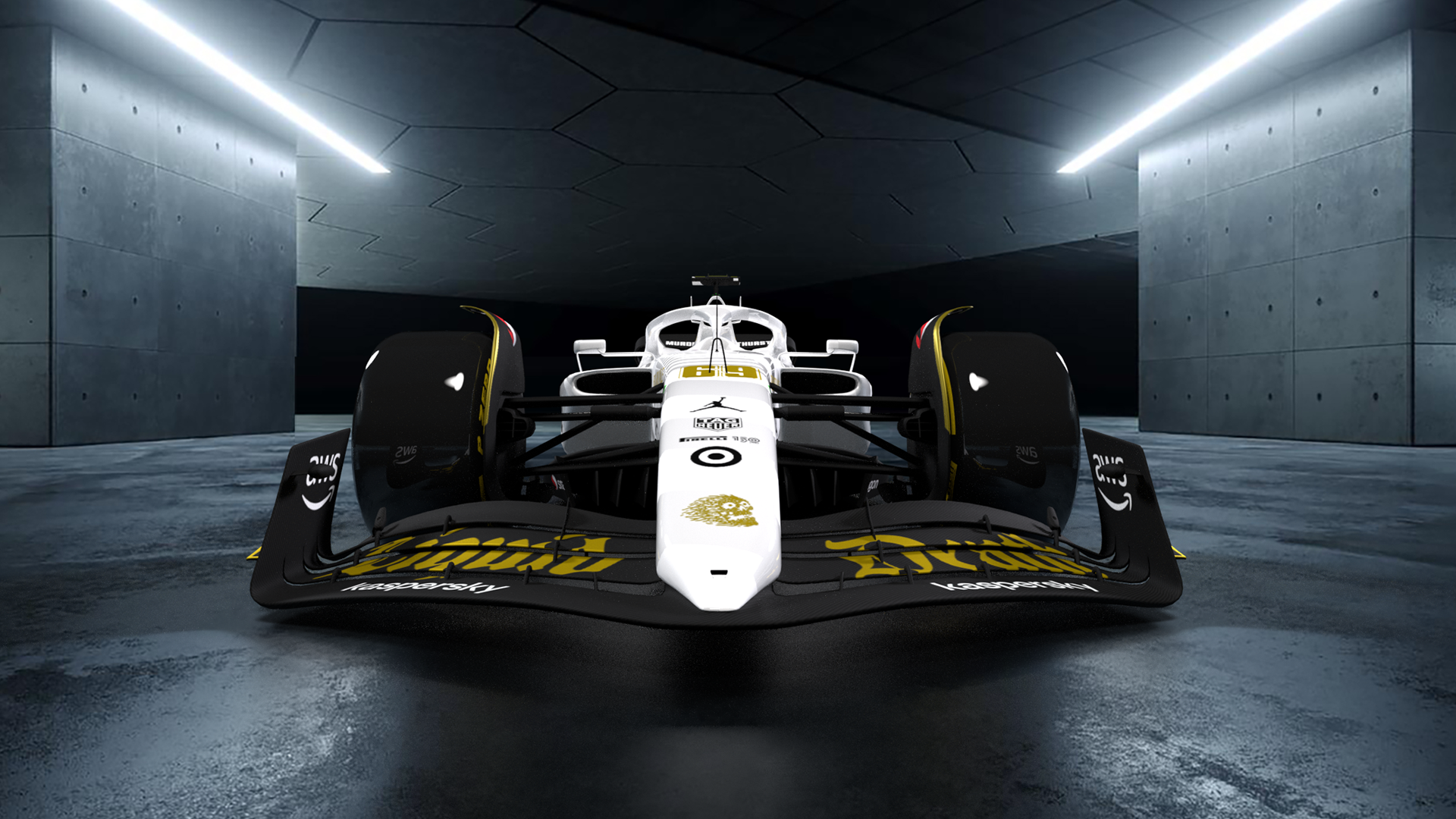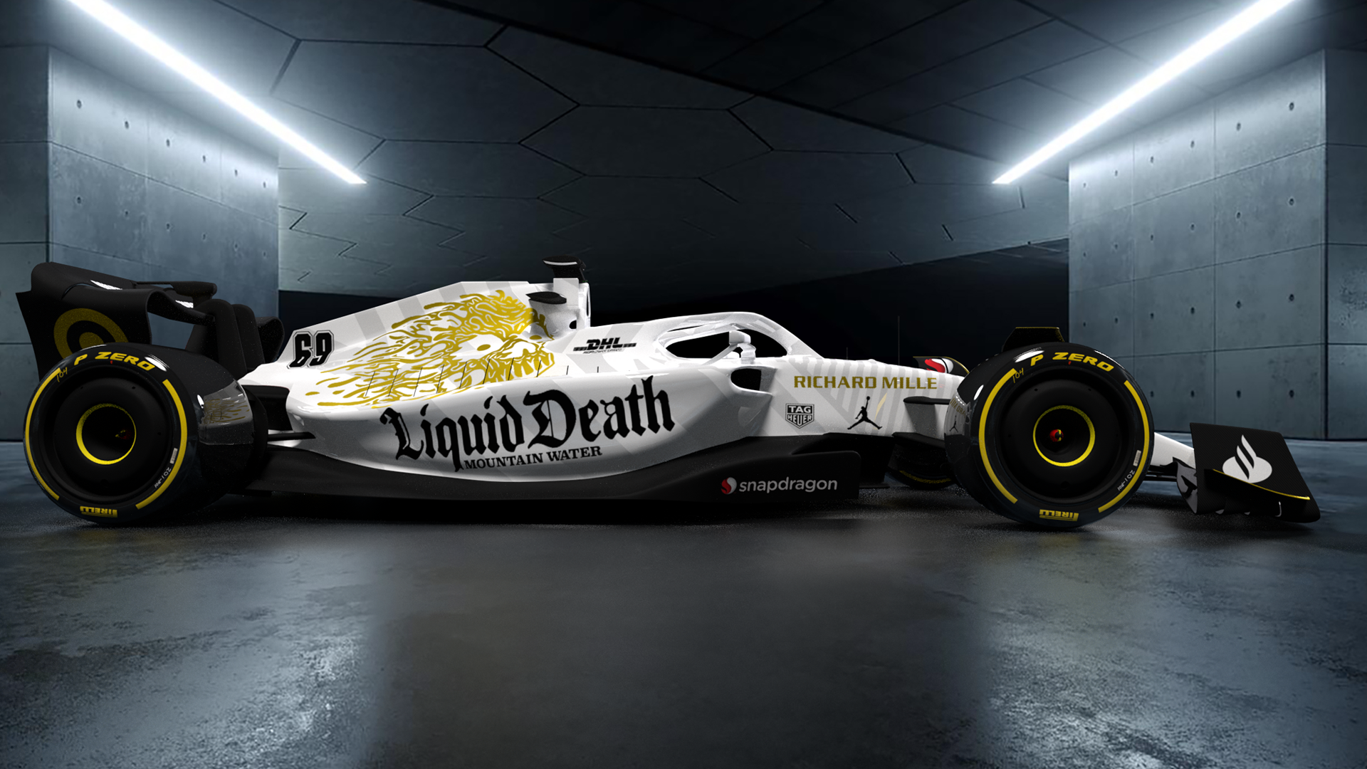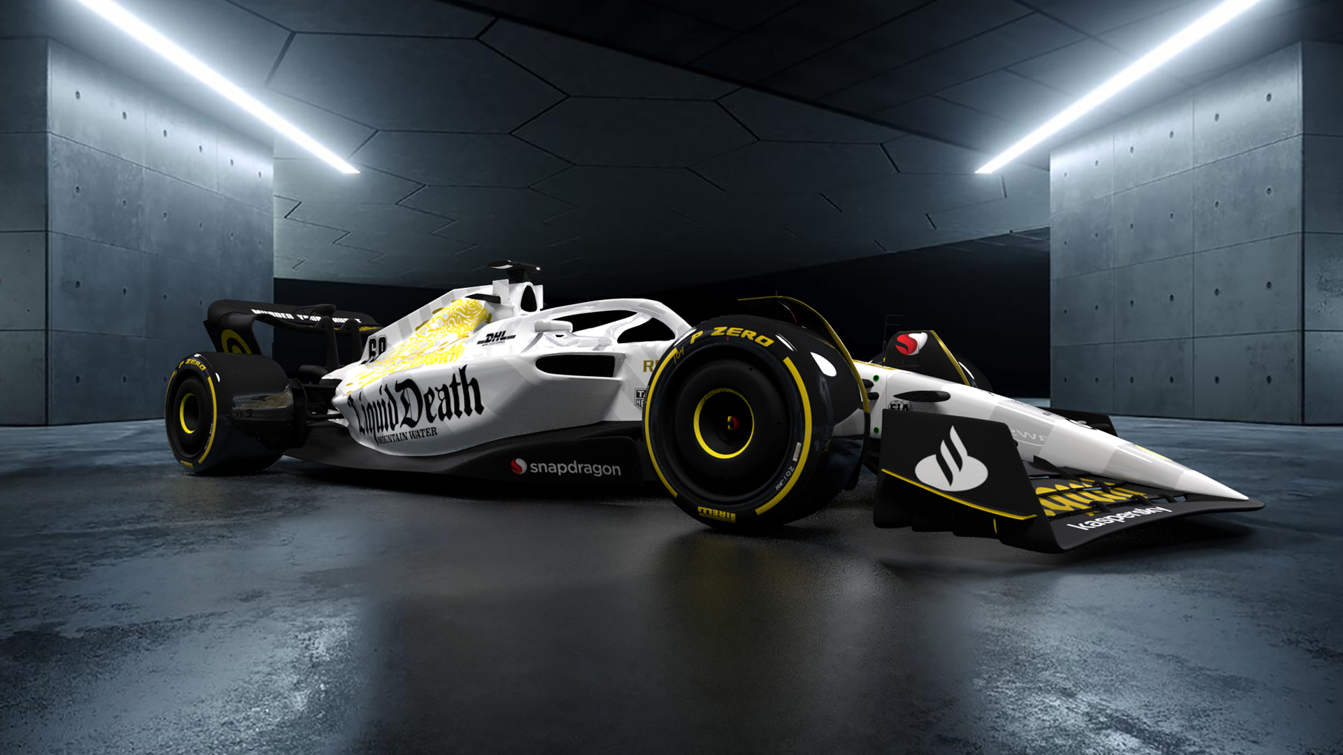 Livery concept for Liquid Death Mountain Water. The main body of the car is a white on white dazzle camo scheme, using metallic and matte white. The black is semi matte. And all the gold logos and graphics are metallic.